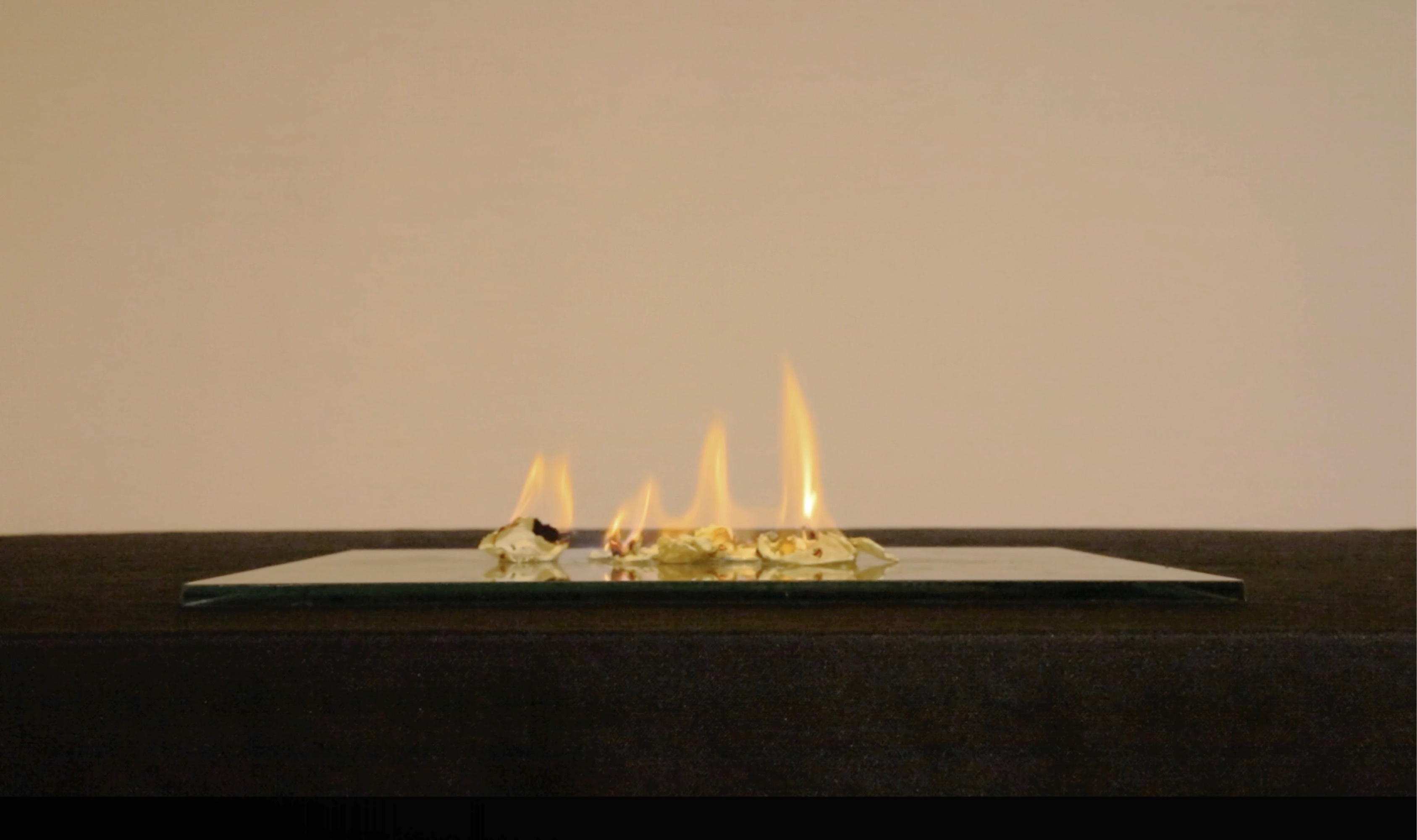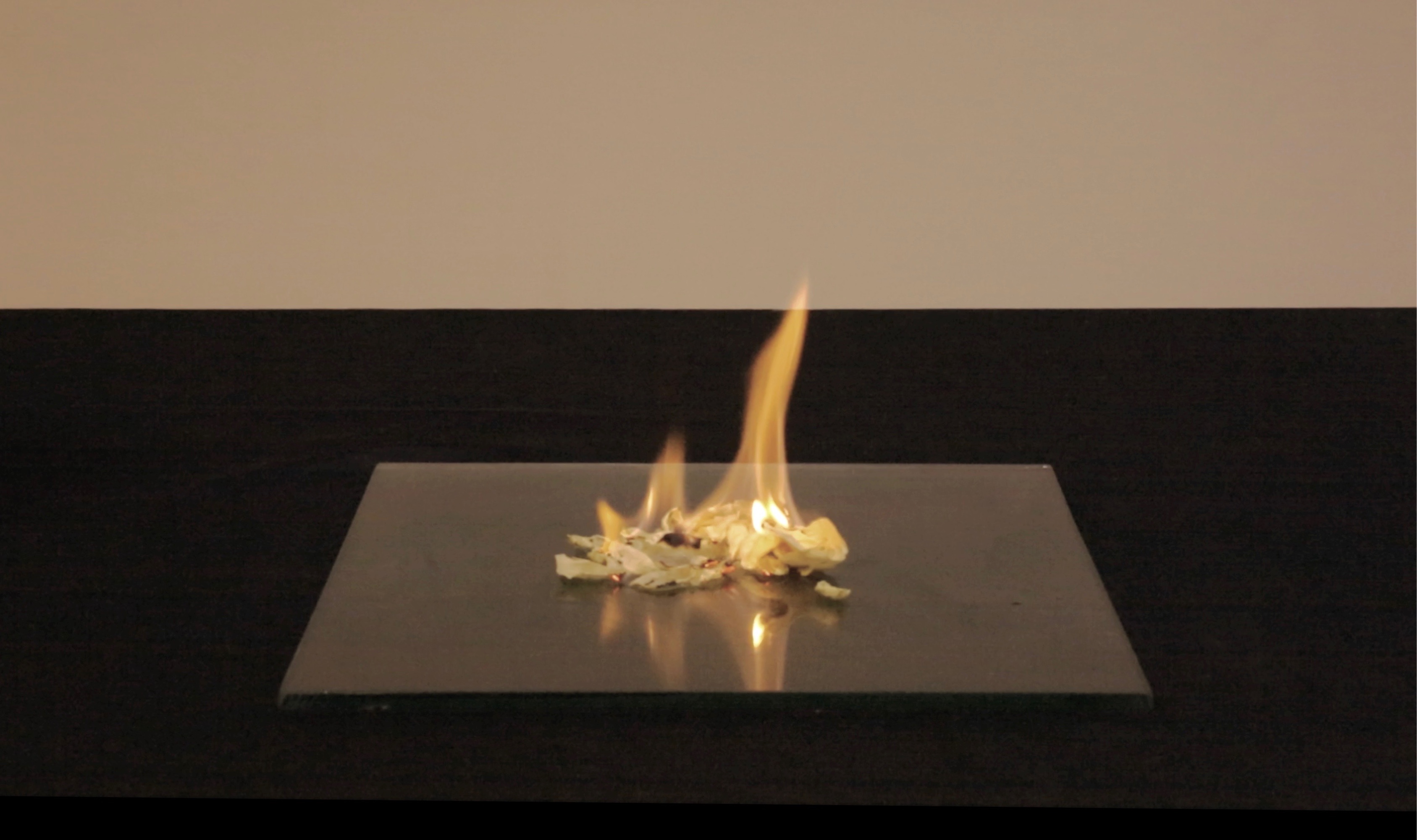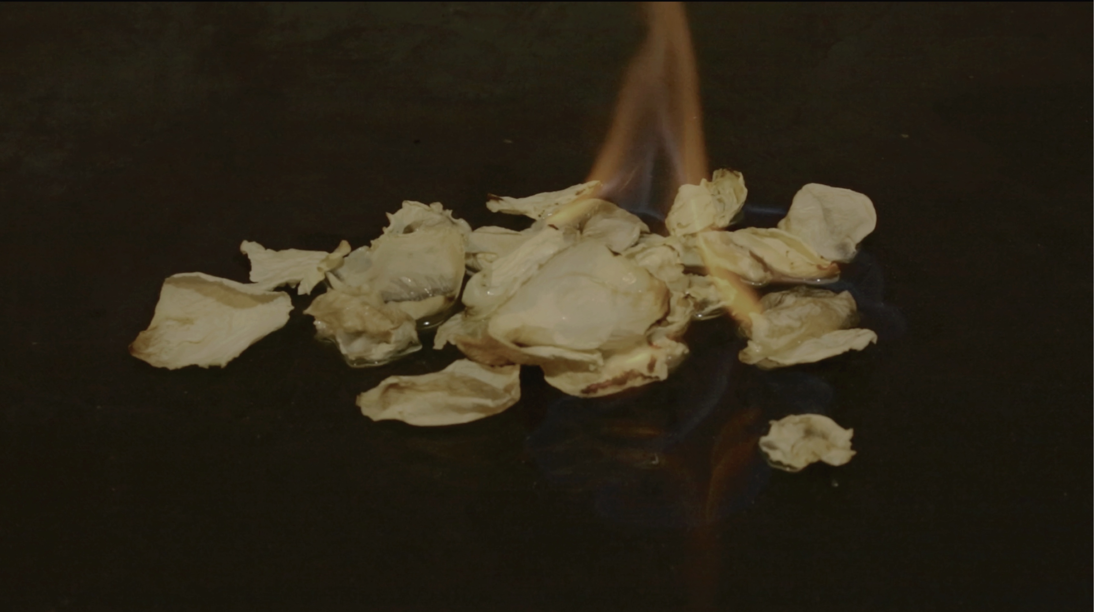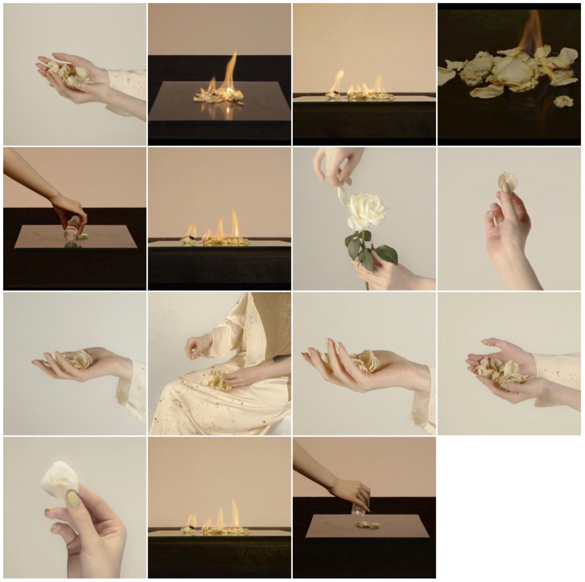 燃烧是一种仪式,广泛存在于各种宗教与习俗,在火焰中消失的事物会来到逝去的人手中。人们热衷于有形的事物,殡仪用品似乎总是钱、房子、车…连慰藉都带有消费社会的色彩,也许人们只是缺乏途径,无形的爱如何寄出。我把抚摸留在花瓣上,在作品的最后,将干枯的花瓣点燃,时间性与物质性的消失,完成了作品的闭环——由火焰将抚摸寄给了她。