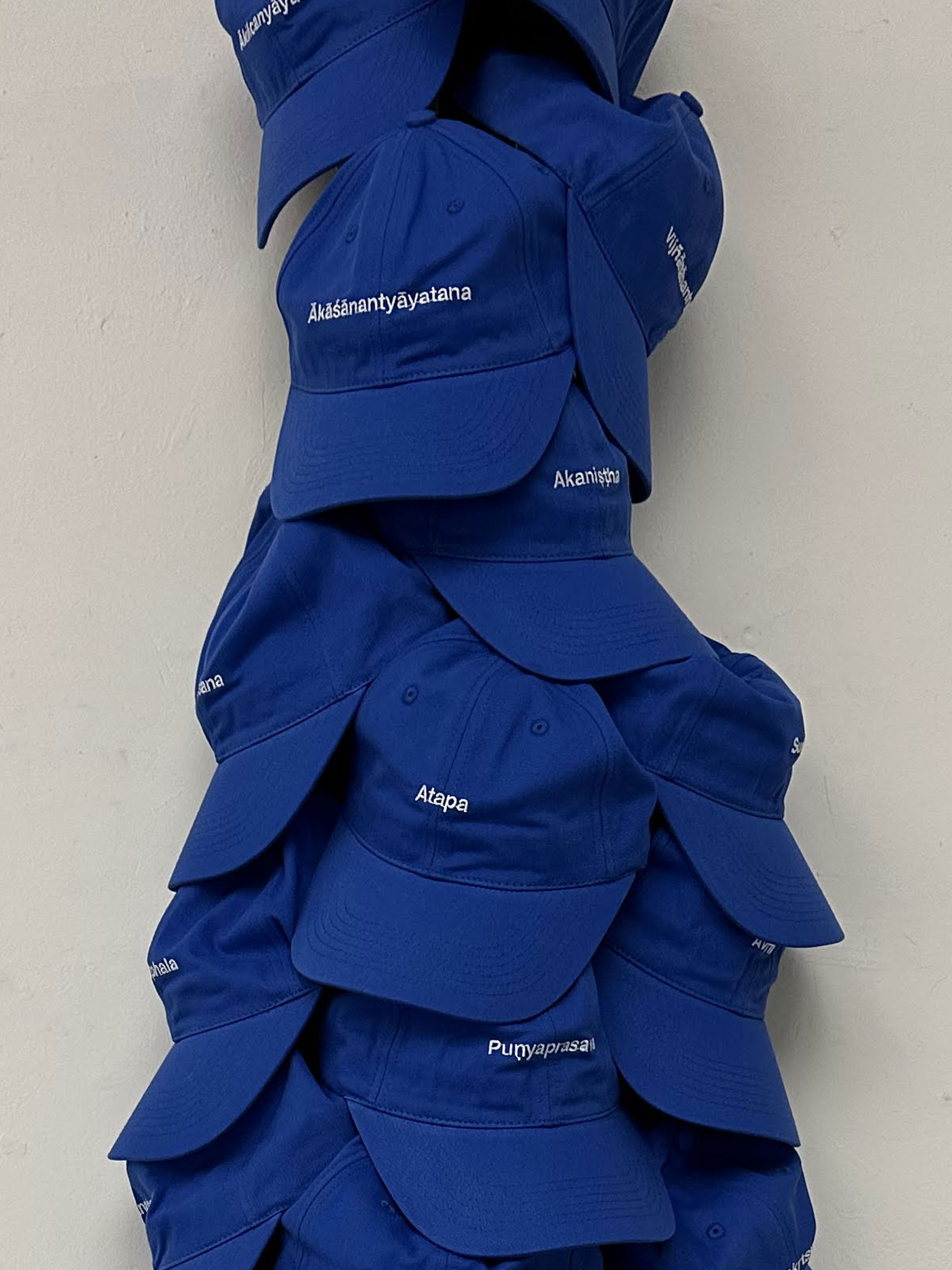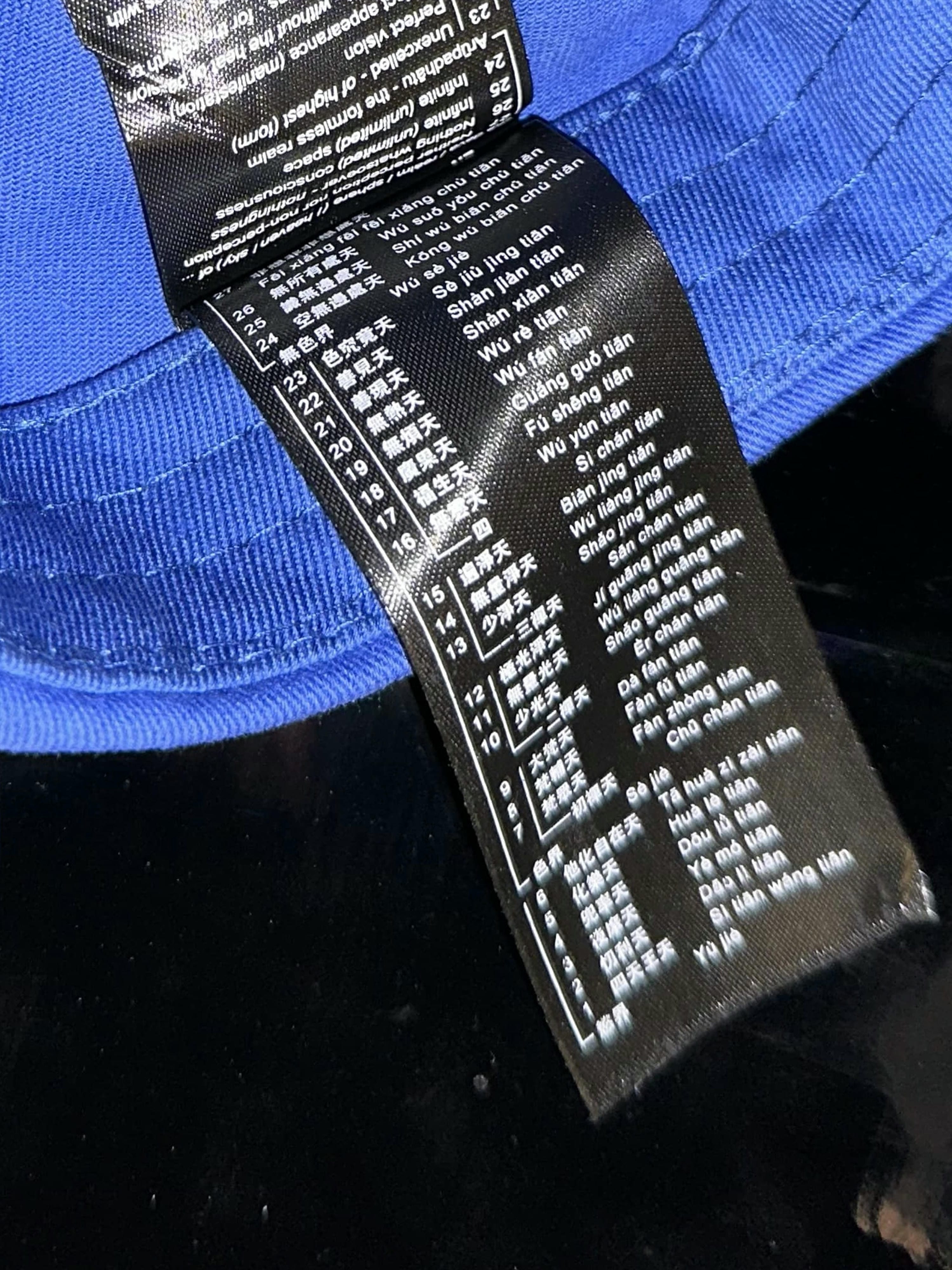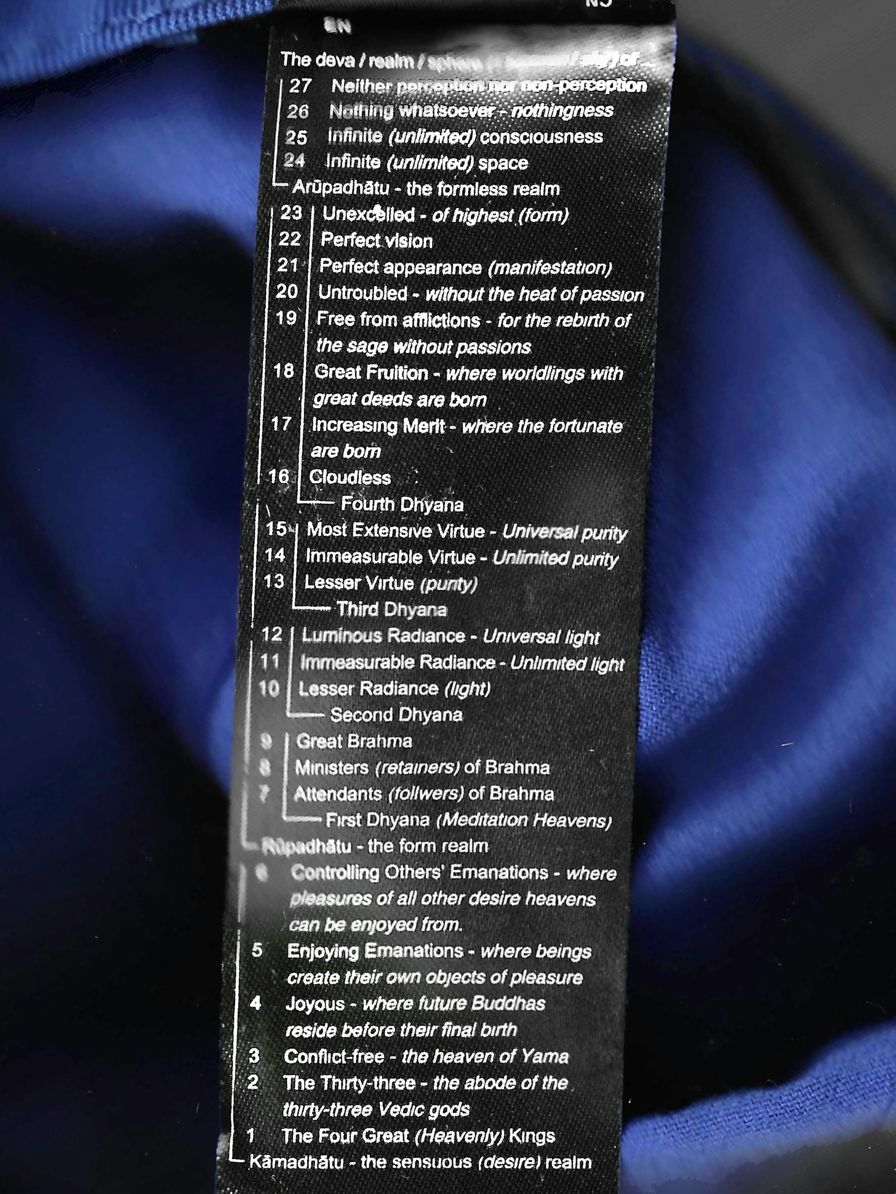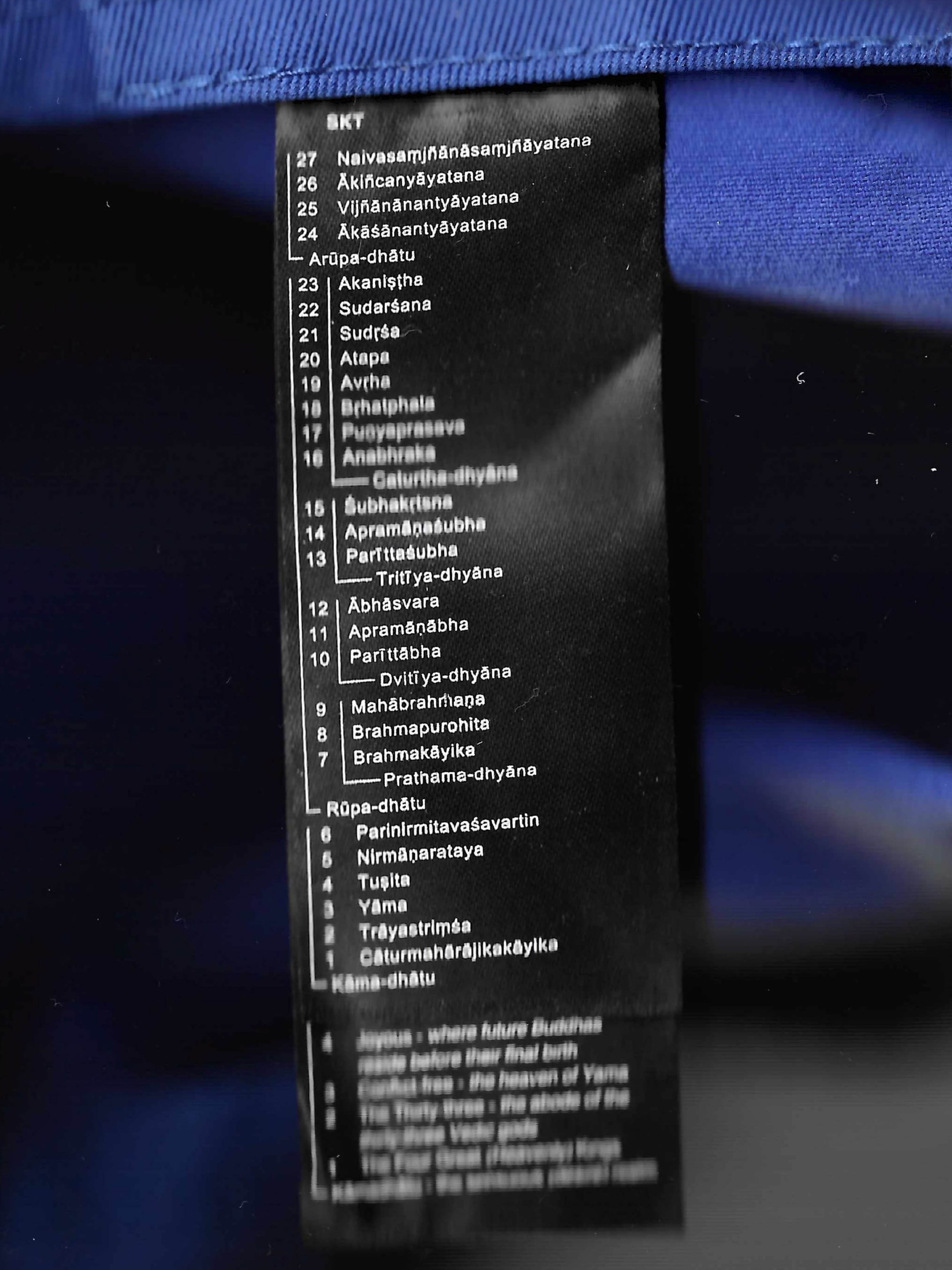 The Balenciaga Logo Embroidered Baseball Cap In Blue Cotton was issued around 2017 and selling currently at around 200 euros. Mimicking its format, 27 blue caps were made with the names of each levels of sky, an info chart of Devaloka is attached inside as washing label, in Sanskrit (Latin spelling), Chinese and English translation.