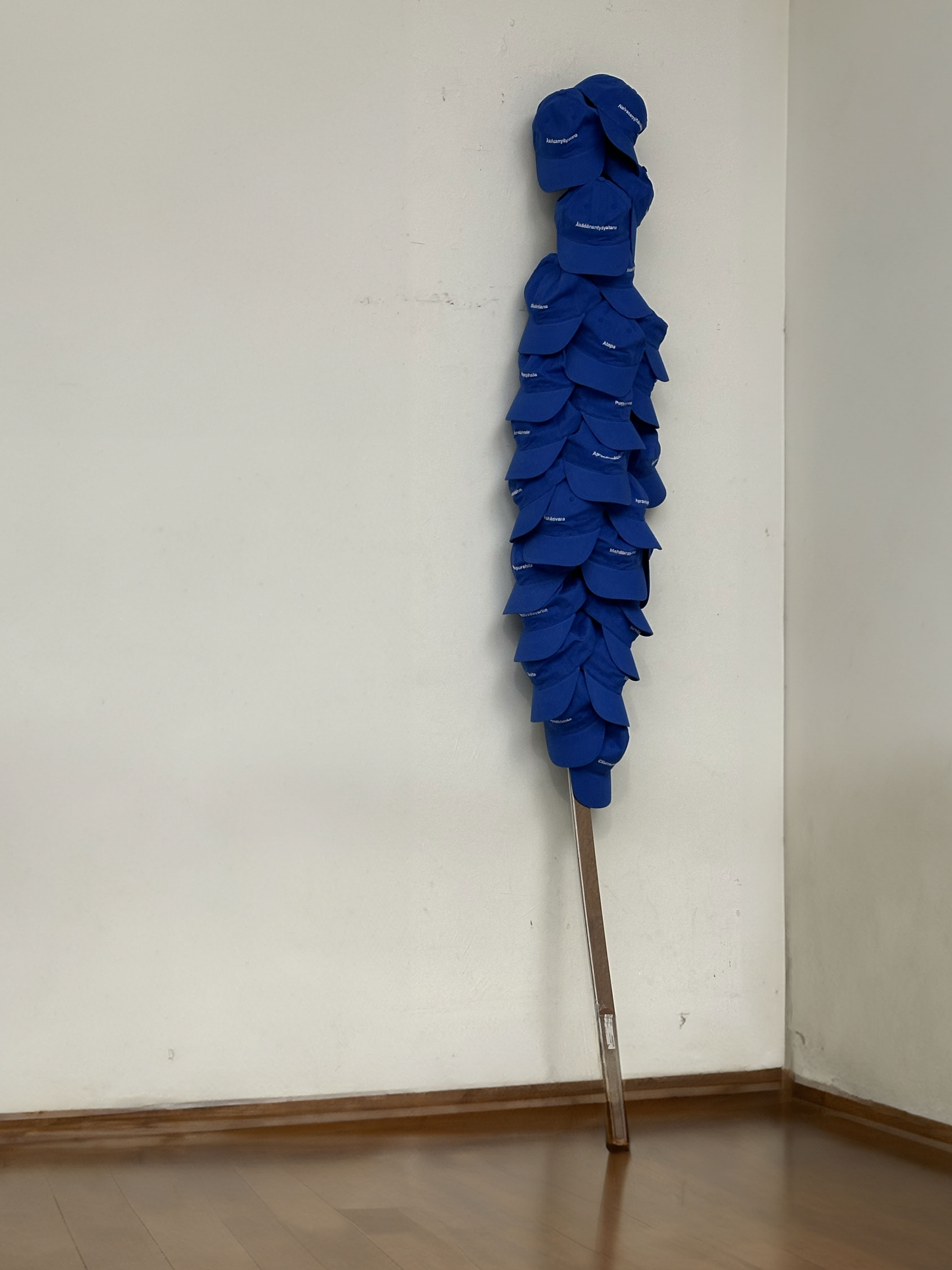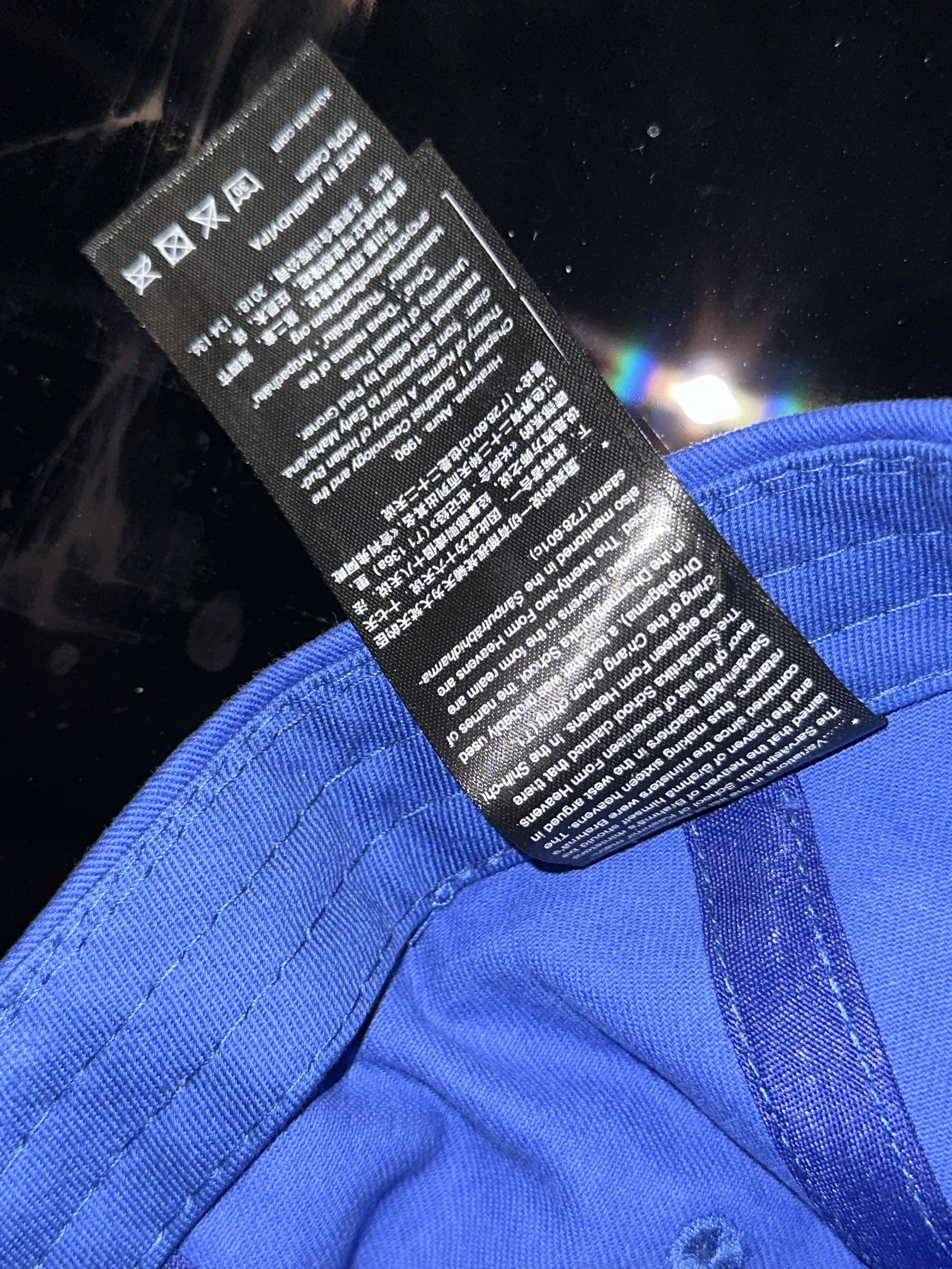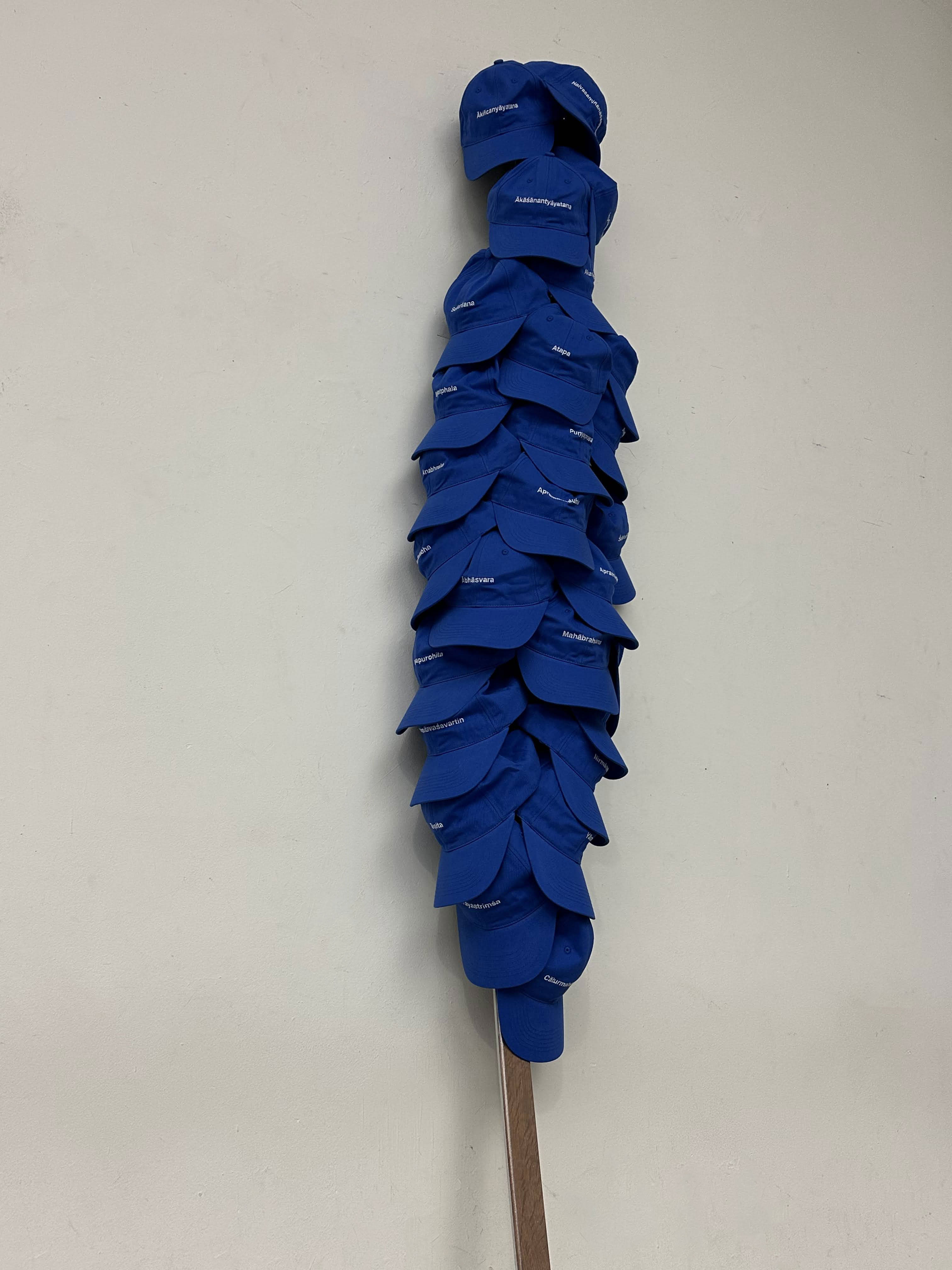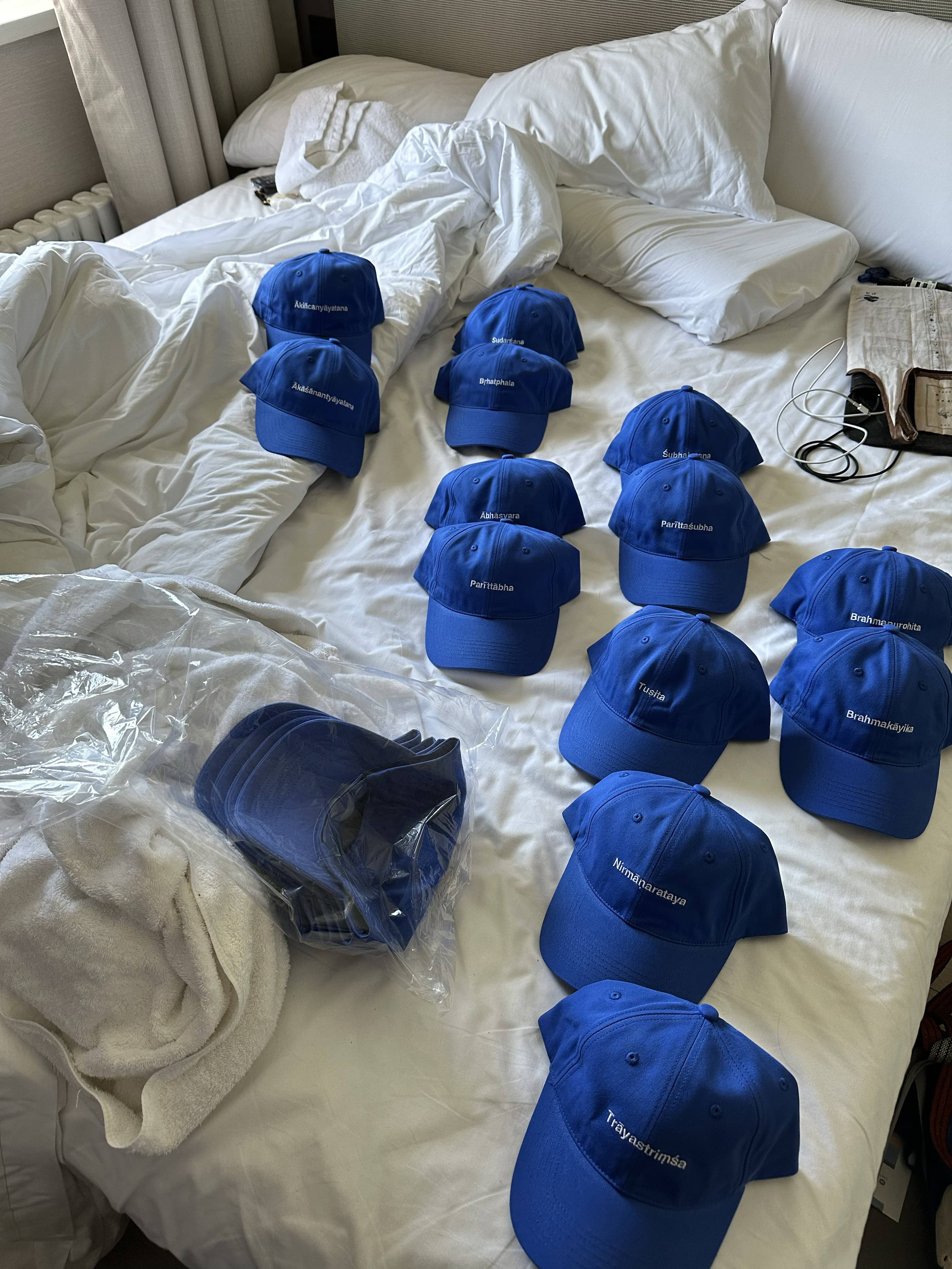 The Balenciaga Logo Embroidered Baseball Cap In Blue Cotton was issued around 2017 and selling currently at around 200 euros. Mimicking its format, 27 blue caps were made with the names of each levels of sky, an info chart of Devaloka is attached inside as washing label, in Sanskrit (Latin spelling), Chinese and English translation.